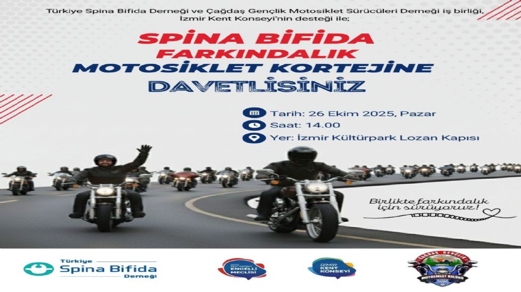 Çağdaş Gençlik Motosiklet Sürücüleri Kulübü iş birliği ve İzmir Kent Konseyi’nin desteğiyle gerçekleştirilecek “Spina Bifida Farkındalık Motosiklet Korteji”, 26 Ekim Pazar günü İzmir sokaklarında farkındalık mesajı taşıyacak.
